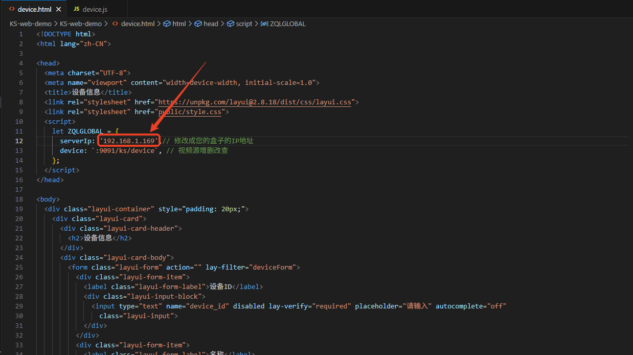 device.html是设备信息demo将文件中的IP地址替换成KS设备的IP地址即可
