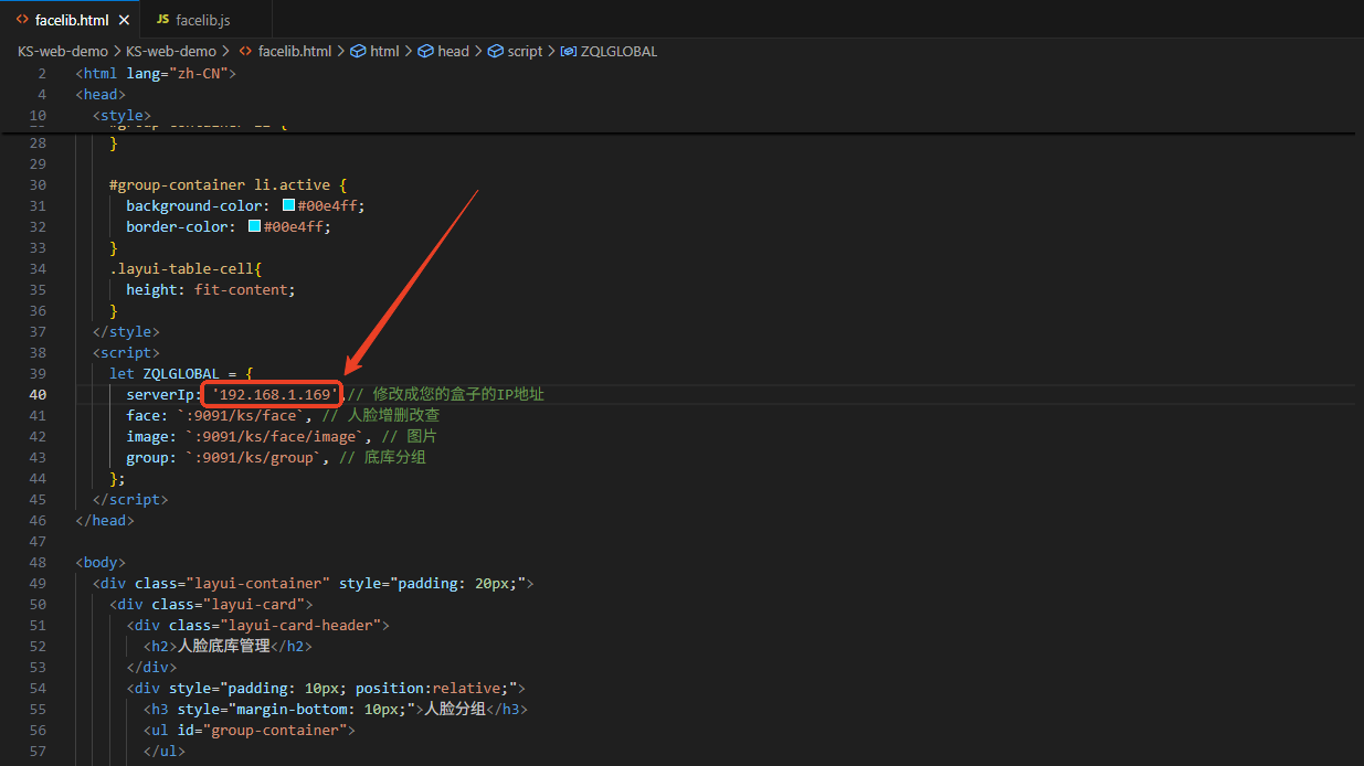 facelib.html是底库分组管理和人脸底库增删改查的demo将文件中的IP地址替换成KS设备的IP地址即可