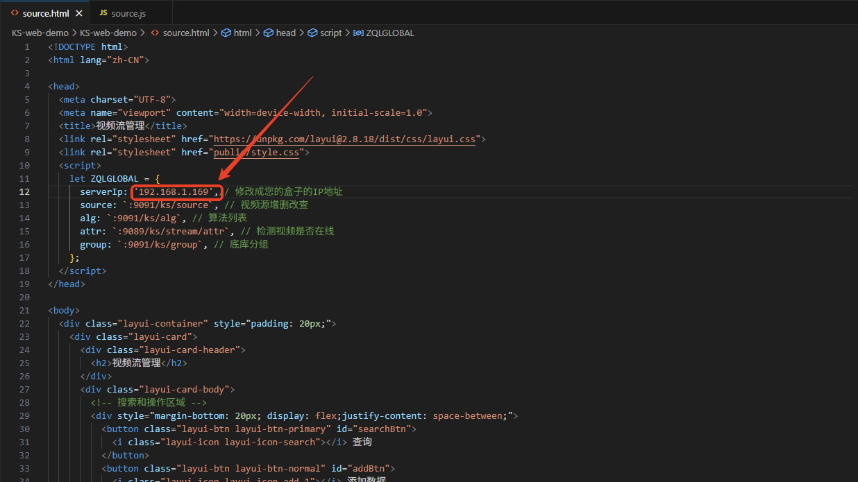 source.html是视频流管理demo将文件中的IP地址替换成KS设备的IP地址即可